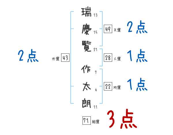 天運![]() | 瑞慶覧作太朗さんの天運は49画の2つ星!不安定な性格で明暗がある人生。周りの人には支援されやすい。 家系が持つ宿命的な運勢を表します。祖先から受け継いだ苗字ですので自分の力が及びません。家柄を象徴します。 |