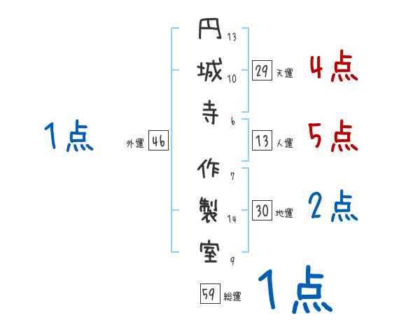 人運![]() | 円城寺作製室さんの人運は13画の5つ星!才能に恵まれ人気がある。名声を手に入れる。円満な人生。 性格や才能などを表す2番目に重要な運勢です。人間関係や協調性、社会的な成功に影響します。主に20歳から50歳ぐらいまでの中年期の運勢を表します。 |
