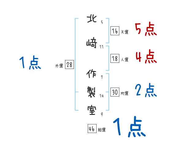 総運![]() | 北﨑作製室さんの総運は46画の1つ星!迷走することが多く苦労するかも。目先のことにとらわれないように。 あなたの人生を表す1番重要な運勢です。生涯を通じて影響する総合運となり、主に50歳以降の晩年期に影響を及ぼします。 |