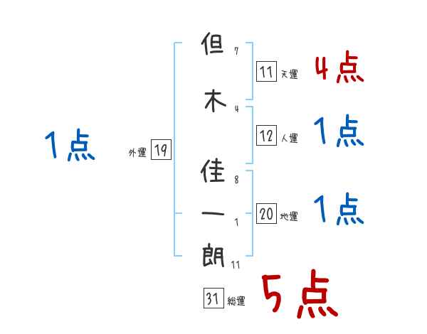 天運![]() | 但木佳一朗さんの天運は11画の4つ星!着実に富や地位を得る幸運な人生。 家系が持つ宿命的な運勢を表します。祖先から受け継いだ苗字ですので自分の力が及びません。家柄を象徴します。 |