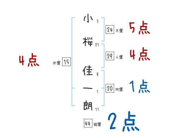 天運![]() | 小桜佳一朗さんの天運は24画の5つ星!家庭運が良く順調な人生。金運にも恵まれる。 家系が持つ宿命的な運勢を表します。祖先から受け継いだ苗字ですので自分の力が及びません。家柄を象徴します。 |