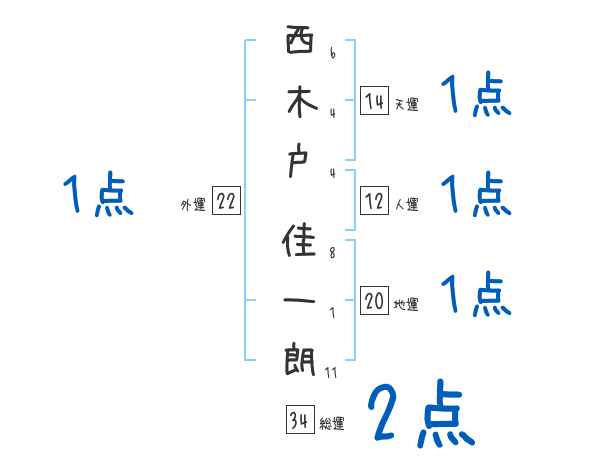 外運![]() | 西木戸佳一朗さんの外運は22画の1つ星!努力することが苦手ないっぽう手先が器用。芸術性にも優れる。 生活面を象徴する運勢です。外部から受ける影響力を表し、結婚運、家庭運や職場、環境への順応性を表します。 |