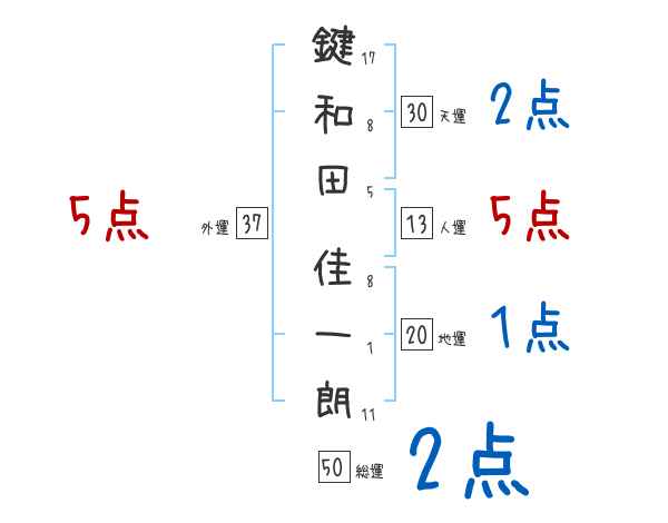総運![]() | 鍵和田佳一朗さんの総運は50画の2つ星!浮き沈みが激しく不安定。しりすぼみに衰退しやすいので注意しましょう。 あなたの人生を表す1番重要な運勢です。生涯を通じて影響する総合運となり、主に50歳以降の晩年期に影響を及ぼします。 |