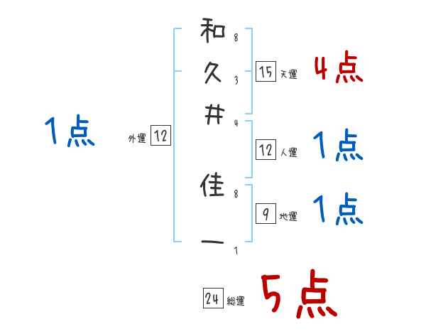 総運![]() | 和久井佳一さんの総運は24画の5つ星!家庭運が良く順調な人生。金運にも恵まれる。 あなたの人生を表す1番重要な運勢です。生涯を通じて影響する総合運となり、主に50歳以降の晩年期に影響を及ぼします。 |