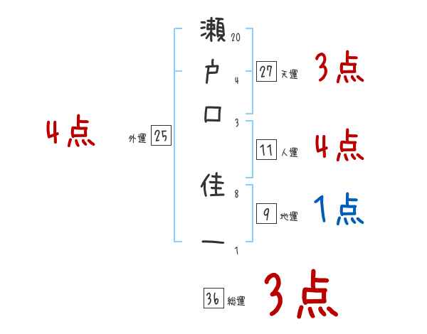 天運![]() | 瀬戸口佳一さんの天運は27画の3つ星!頭脳明晰だが強情で摩擦が多い傾向。孤立に注意。 家系が持つ宿命的な運勢を表します。祖先から受け継いだ苗字ですので自分の力が及びません。家柄を象徴します。 |