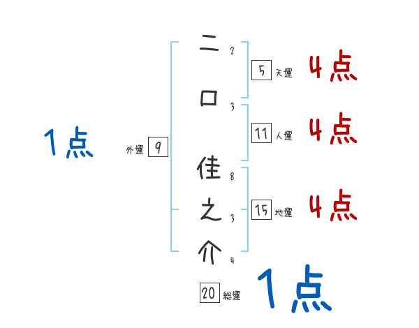 天運![]() | 二口佳之介さんの天運は5画の4つ星!健康で安泰。協調性に優れ、財産に恵まれる。 家系が持つ宿命的な運勢を表します。祖先から受け継いだ苗字ですので自分の力が及びません。家柄を象徴します。 |