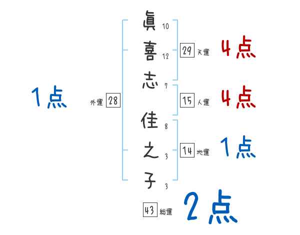 外運![]() | 眞喜志佳之子さんの外運は28画の1つ星!家庭環境に注意。スポーツで活躍できる能力があるかも。 生活面を象徴する運勢です。外部から受ける影響力を表し、結婚運、家庭運や職場、環境への順応性を表します。 |