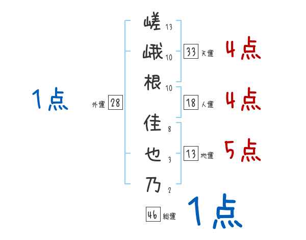 総運![]() | 嵯峨根佳也乃さんの総運は46画の1つ星!迷走することが多く苦労するかも。目先のことにとらわれないように。 あなたの人生を表す1番重要な運勢です。生涯を通じて影響する総合運となり、主に50歳以降の晩年期に影響を及ぼします。 |