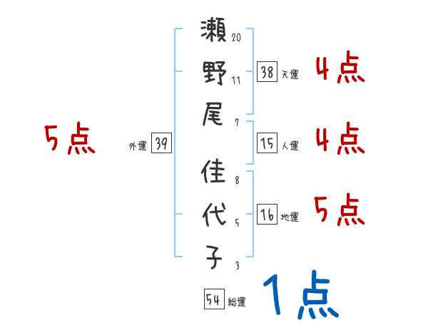 外運![]() | 瀬野尾佳代子さんの外運は39画の5つ星!社交性に優れ人望が厚い。人の上に立ち成功する。 生活面を象徴する運勢です。外部から受ける影響力を表し、結婚運、家庭運や職場、環境への順応性を表します。 |