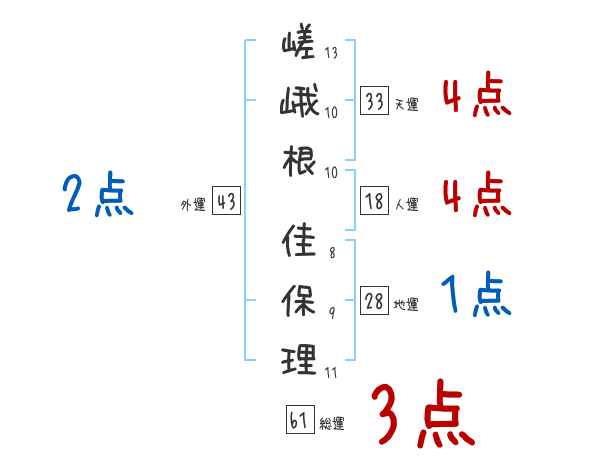 天運![]() | 嵯峨根佳保理さんの天運は33画の4つ星!権力志向でプライドが高い。勇気があり運を切り開き成功する。 家系が持つ宿命的な運勢を表します。祖先から受け継いだ苗字ですので自分の力が及びません。家柄を象徴します。 |