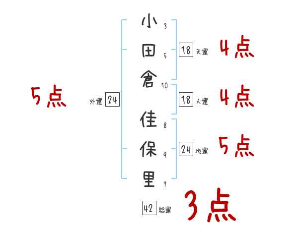 外運![]() | 小田倉佳保里さんの外運は24画の5つ星!家庭運が良く順調な人生。金運にも恵まれる。 生活面を象徴する運勢です。外部から受ける影響力を表し、結婚運、家庭運や職場、環境への順応性を表します。 |