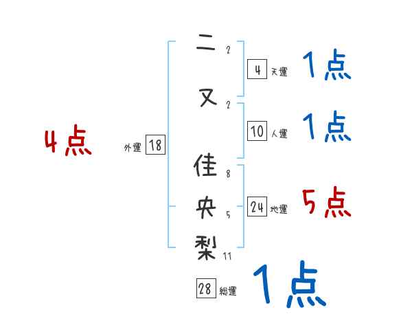 天運![]() | 二又佳央梨さんの天運は4画の1つ星!感情が不安定で苦労するかも。周囲との協調を心掛けましょう。 家系が持つ宿命的な運勢を表します。祖先から受け継いだ苗字ですので自分の力が及びません。家柄を象徴します。 |