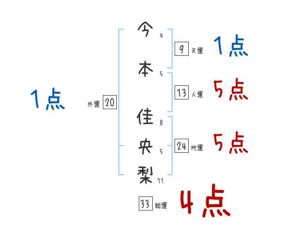 天運![]() | 今本佳央梨さんの天運は9画の1つ星!消極的で才能を発揮することが苦手なことも。周りの意見に耳を傾けましょう。 家系が持つ宿命的な運勢を表します。祖先から受け継いだ苗字ですので自分の力が及びません。家柄を象徴します。 |