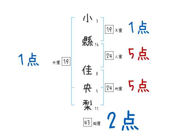 外運![]() | 小縣佳央梨さんの外運は19画の1つ星!優れた才能を持ちますが、協調性が足りないことも。周りの人と協力する事を意識しましょう。 生活面を象徴する運勢です。外部から受ける影響力を表し、結婚運、家庭運や職場、環境への順応性を表します。 |