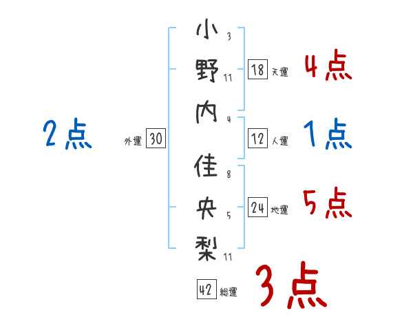 総運![]() | 小野内佳央梨さんの総運は42画の3つ星!病気に注意。多芸であるが消極的でおとなしい。 あなたの人生を表す1番重要な運勢です。生涯を通じて影響する総合運となり、主に50歳以降の晩年期に影響を及ぼします。 |