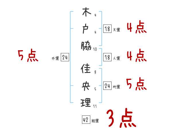 外運![]() | 木戸脇佳央理さんの外運は24画の5つ星!家庭運が良く順調な人生。金運にも恵まれる。 生活面を象徴する運勢です。外部から受ける影響力を表し、結婚運、家庭運や職場、環境への順応性を表します。 |