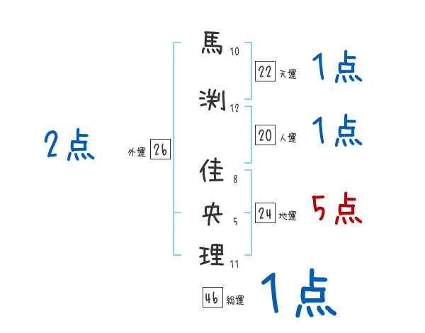 外運![]() | 馬渕佳央理さんの外運は26画の2つ星!波瀾万丈かも。信頼できる人を大事にしましょう。 生活面を象徴する運勢です。外部から受ける影響力を表し、結婚運、家庭運や職場、環境への順応性を表します。 |