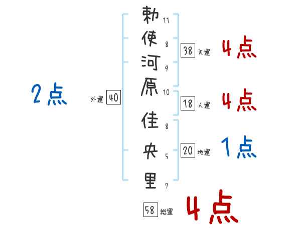 天運![]() | 勅使河原佳央里さんの天運は38画の4つ星!温厚な性格で技術的な才能を発揮する。職人的な仕事に向いている。 家系が持つ宿命的な運勢を表します。祖先から受け継いだ苗字ですので自分の力が及びません。家柄を象徴します。 |