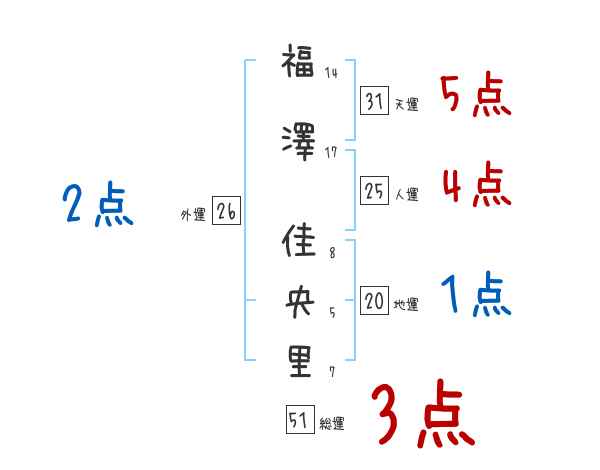 外運![]() | 福澤佳央里さんの外運は26画の2つ星!波瀾万丈かも。信頼できる人を大事にしましょう。 生活面を象徴する運勢です。外部から受ける影響力を表し、結婚運、家庭運や職場、環境への順応性を表します。 |