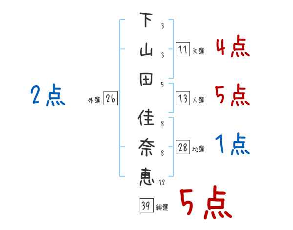 総運![]() | 下山田佳奈恵さんの総運は39画の5つ星!社交性に優れ人望が厚い。人の上に立ち成功する。 あなたの人生を表す1番重要な運勢です。生涯を通じて影響する総合運となり、主に50歳以降の晩年期に影響を及ぼします。 |