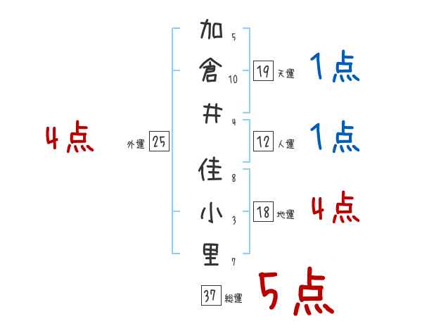 総運![]() | 加倉井佳小里さんの総運は37画の5つ星!努力家で順応性に優れる。現実的な考え方ができ忠実に物事をこなす。 あなたの人生を表す1番重要な運勢です。生涯を通じて影響する総合運となり、主に50歳以降の晩年期に影響を及ぼします。 |