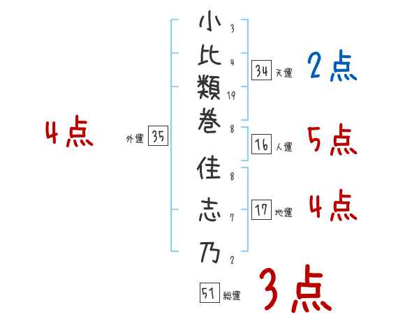 外運![]() | 小比類巻佳志乃さんの外運は35画の4つ星!温厚な性格で感受性が高い。穏和な性格で人望が厚い。 生活面を象徴する運勢です。外部から受ける影響力を表し、結婚運、家庭運や職場、環境への順応性を表します。 |