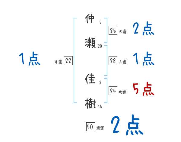 人運![]() | 仲瀬佳樹さんの人運は28画の1つ星!家庭環境に注意。スポーツで活躍できる能力があるかも。 性格や才能などを表す2番目に重要な運勢です。人間関係や協調性、社会的な成功に影響します。主に20歳から50歳ぐらいまでの中年期の運勢を表します。 |
