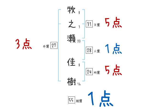 総運![]() | 牧之瀬佳樹さんの総運は55画の1つ星!欲張りな性格で軽率な行動に注意しましょう。病気に気をつけて。 あなたの人生を表す1番重要な運勢です。生涯を通じて影響する総合運となり、主に50歳以降の晩年期に影響を及ぼします。 |