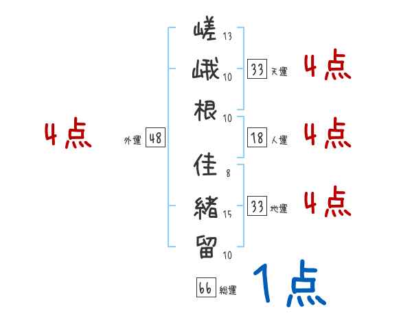 総運![]() | 嵯峨根佳緒留さんの総運は66画の1つ星!迷うことが多く挫折しやすい傾向が。辛抱強く物事に取り組みましょう。 あなたの人生を表す1番重要な運勢です。生涯を通じて影響する総合運となり、主に50歳以降の晩年期に影響を及ぼします。 |