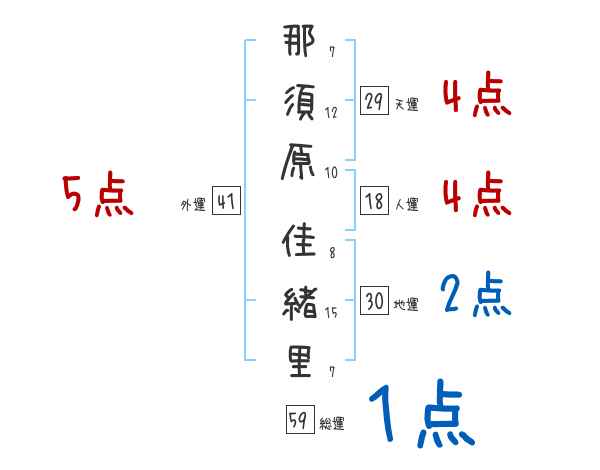 天運![]() | 那須原佳緒里さんの天運は29画の4つ星!完全主義で才能がある。厳格な心の持ち主。 家系が持つ宿命的な運勢を表します。祖先から受け継いだ苗字ですので自分の力が及びません。家柄を象徴します。 |