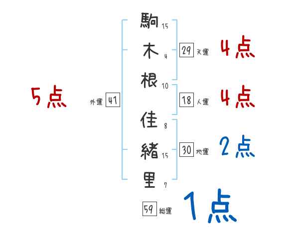 天運![]() | 駒木根佳緒里さんの天運は29画の4つ星!完全主義で才能がある。厳格な心の持ち主。 家系が持つ宿命的な運勢を表します。祖先から受け継いだ苗字ですので自分の力が及びません。家柄を象徴します。 |