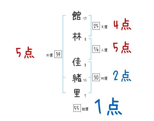 外運![]() | 館林佳緒里さんの外運は39画の5つ星!社交性に優れ人望が厚い。人の上に立ち成功する。 生活面を象徴する運勢です。外部から受ける影響力を表し、結婚運、家庭運や職場、環境への順応性を表します。 |