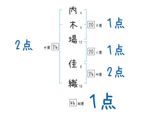 外運![]() | 内木場佳織さんの外運は26画の2つ星!波瀾万丈かも。信頼できる人を大事にしましょう。 生活面を象徴する運勢です。外部から受ける影響力を表し、結婚運、家庭運や職場、環境への順応性を表します。 |