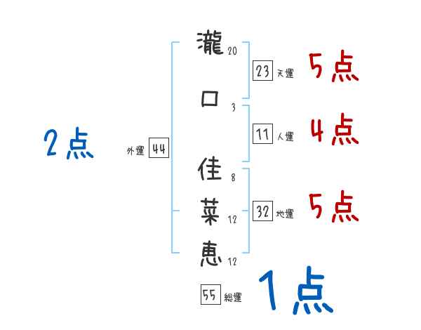 天運![]() | 瀧口佳菜恵さんの天運は23画の5つ星!想像力に優れ活力がある。一代で成功し名誉を手に入れる。 家系が持つ宿命的な運勢を表します。祖先から受け継いだ苗字ですので自分の力が及びません。家柄を象徴します。 |