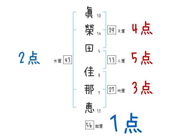 人運![]() | 眞榮田佳那恵さんの人運は13画の5つ星!才能に恵まれ人気がある。名声を手に入れる。円満な人生。 性格や才能などを表す2番目に重要な運勢です。人間関係や協調性、社会的な成功に影響します。主に20歳から50歳ぐらいまでの中年期の運勢を表します。 |