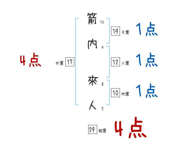外運![]() | 箭内來人さんの外運は17画の4つ星!積極的な行動力。地位を気づき財産を手に入れる。純粋な心と直感力。 生活面を象徴する運勢です。外部から受ける影響力を表し、結婚運、家庭運や職場、環境への順応性を表します。 |