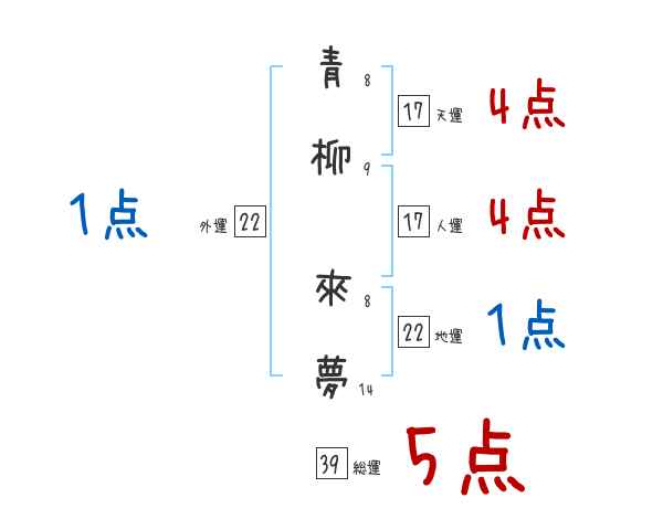 天運![]() | 青柳來夢さんの天運は17画の4つ星!積極的な行動力。地位を気づき財産を手に入れる。純粋な心と直感力。 家系が持つ宿命的な運勢を表します。祖先から受け継いだ苗字ですので自分の力が及びません。家柄を象徴します。 |