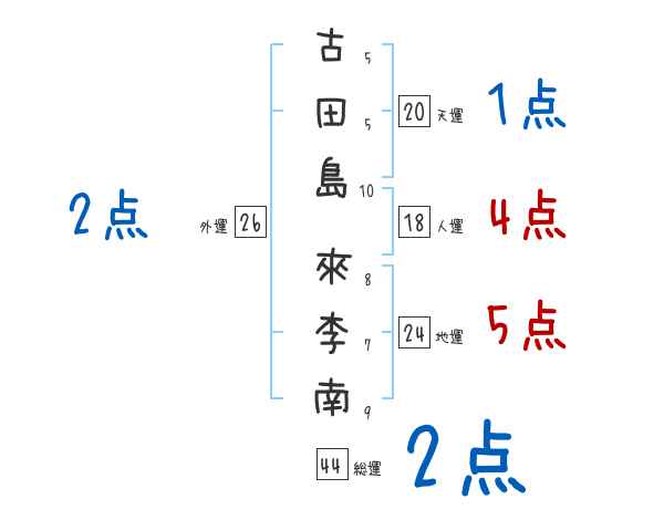 外運![]() | 古田島來李南さんの外運は26画の2つ星!波瀾万丈かも。信頼できる人を大事にしましょう。 生活面を象徴する運勢です。外部から受ける影響力を表し、結婚運、家庭運や職場、環境への順応性を表します。 |