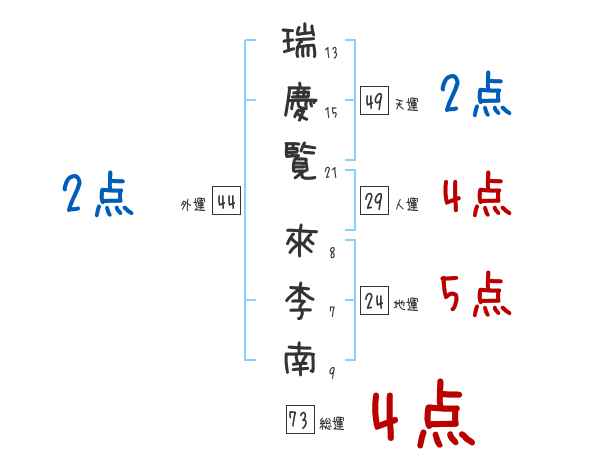 総運![]() | 瑞慶覧來李南さんの総運は73画の4つ星!天徳のある人生。散財に注意すれば晩年幸福。 あなたの人生を表す1番重要な運勢です。生涯を通じて影響する総合運となり、主に50歳以降の晩年期に影響を及ぼします。 |