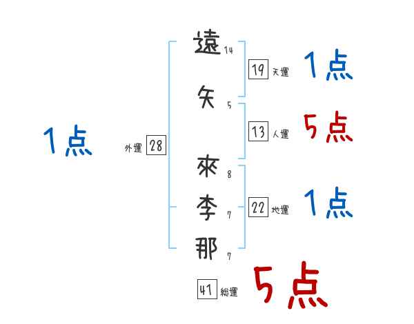 人運![]() | 遠矢來李那さんの人運は13画の5つ星!才能に恵まれ人気がある。名声を手に入れる。円満な人生。 性格や才能などを表す2番目に重要な運勢です。人間関係や協調性、社会的な成功に影響します。主に20歳から50歳ぐらいまでの中年期の運勢を表します。 |