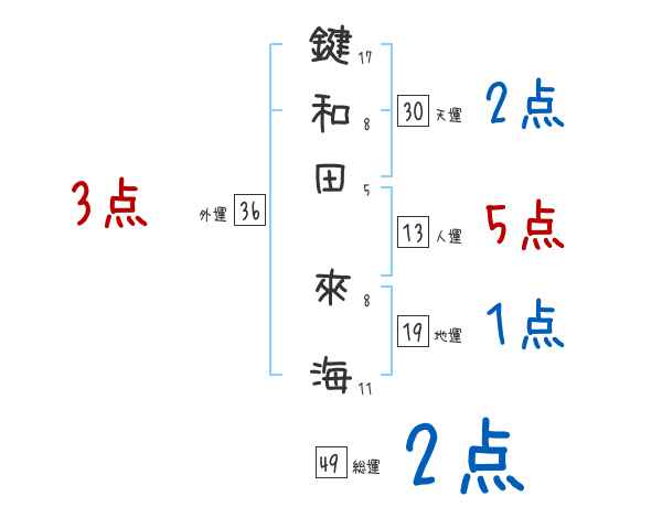 天運![]() | 鍵和田來海さんの天運は30画の2つ星!浮き沈みの激しさに注意しましょう。 家系が持つ宿命的な運勢を表します。祖先から受け継いだ苗字ですので自分の力が及びません。家柄を象徴します。 |