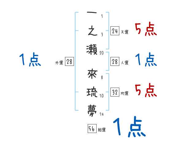 外運![]() | 一之瀬來琉夢さんの外運は28画の1つ星!家庭環境に注意。スポーツで活躍できる能力があるかも。 生活面を象徴する運勢です。外部から受ける影響力を表し、結婚運、家庭運や職場、環境への順応性を表します。 |