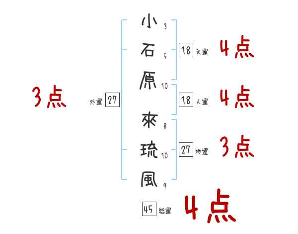 天運![]() | 小石原來琉風さんの天運は18画の4つ星!情熱的で剛気。忍耐力があり信頼される。 家系が持つ宿命的な運勢を表します。祖先から受け継いだ苗字ですので自分の力が及びません。家柄を象徴します。 |