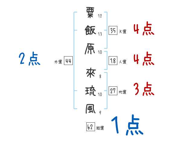 外運![]() | 粟飯原來琉風さんの外運は44画の2つ星!誠実で慎重な性格。物事を考えすぎないように注意しましょう。 生活面を象徴する運勢です。外部から受ける影響力を表し、結婚運、家庭運や職場、環境への順応性を表します。 |