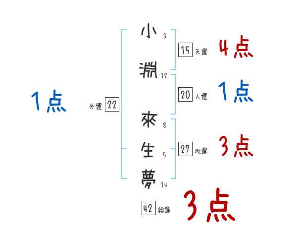 総運![]() | 小淵來生夢さんの総運は42画の3つ星!病気に注意。多芸であるが消極的でおとなしい。 あなたの人生を表す1番重要な運勢です。生涯を通じて影響する総合運となり、主に50歳以降の晩年期に影響を及ぼします。 |