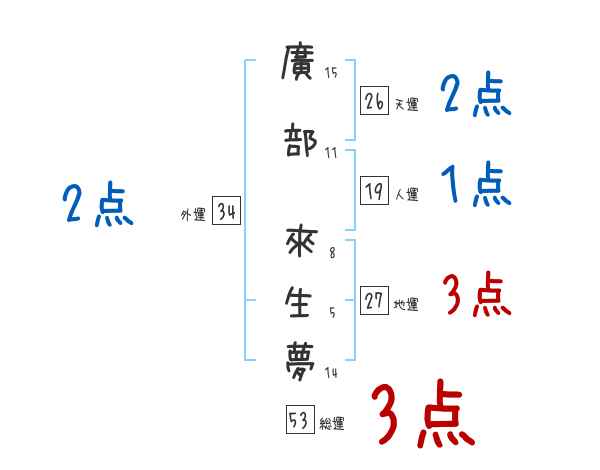 総運![]() | 廣部來生夢さんの総運は53画の3つ星!やや見栄っ張りで虚栄心がある。散財に注意。 あなたの人生を表す1番重要な運勢です。生涯を通じて影響する総合運となり、主に50歳以降の晩年期に影響を及ぼします。 |