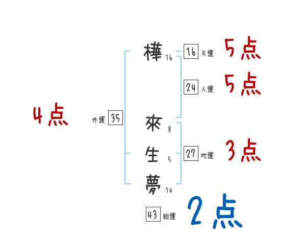 外運![]() | 樺來生夢さんの外運は35画の4つ星!温厚な性格で感受性が高い。穏和な性格で人望が厚い。 生活面を象徴する運勢です。外部から受ける影響力を表し、結婚運、家庭運や職場、環境への順応性を表します。 |