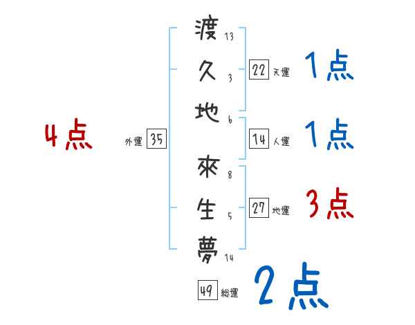 外運![]() | 渡久地來生夢さんの外運は35画の4つ星!温厚な性格で感受性が高い。穏和な性格で人望が厚い。 生活面を象徴する運勢です。外部から受ける影響力を表し、結婚運、家庭運や職場、環境への順応性を表します。 |