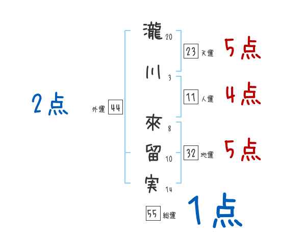 | 天運  | 瀧川來留実さんの天運は23画の5つ星!想像力に優れ活力がある。一代で成功し名誉を手に入れる。家系が持つ宿命的な運勢を表します。祖先から受け継いだ苗字ですので自分の力が及びません。家柄を象徴します。 |
