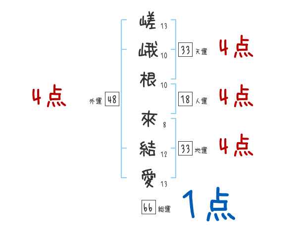 天運![]() | 嵯峨根來結愛さんの天運は33画の4つ星!権力志向でプライドが高い。勇気があり運を切り開き成功する。 家系が持つ宿命的な運勢を表します。祖先から受け継いだ苗字ですので自分の力が及びません。家柄を象徴します。 |